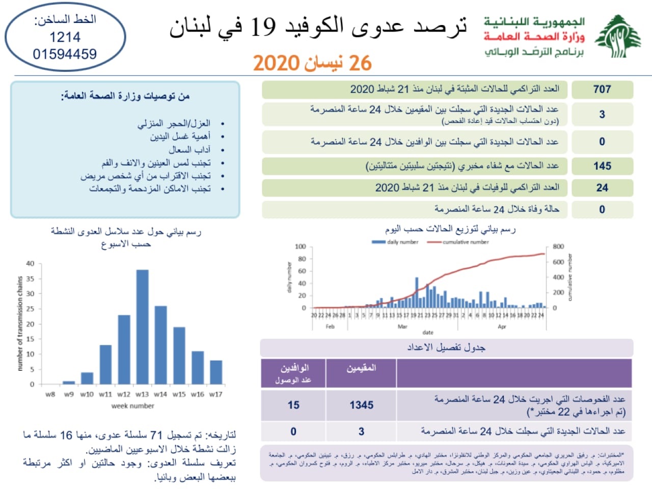 وزارة الصحة اللبنانية: 3 اصابات كورونا جديدة رفعت عدد الحالات المثبتة الى 707