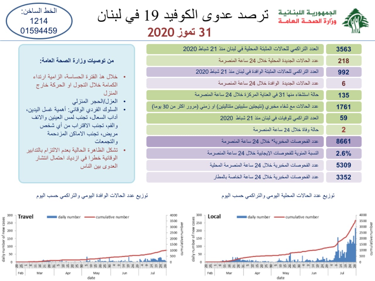 وزارة الصحة اللبنانية : 224 إصابة جديدة بفيروس كورونا خلال 24 ساعة