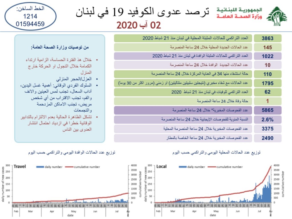 كورونا في لبنان.. تسجيل 155 إصابة وحالة وفاة جديدة