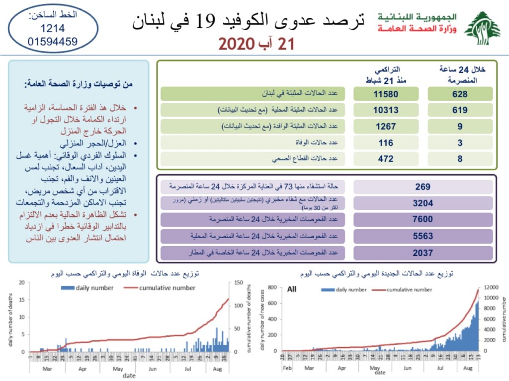 كورونا في لبنان.. تسجيل 628 إصابة جديدة و3 وفيات