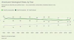 يمكن تفسير الفرق بين هذين المقياسين بسهولة. على الرغم من التوسع بنسبة 6 نقاط مئوية منذ هزيمة جيمي كارتر في العام 1980، لا يزال الليبراليون الذين يعرّفون أنفسهم بأنفسهم يشكلون أصغر نسبة من الناخبين، كما كان الحال منذ أربعة عقود – كما يشير الجدول التالي.