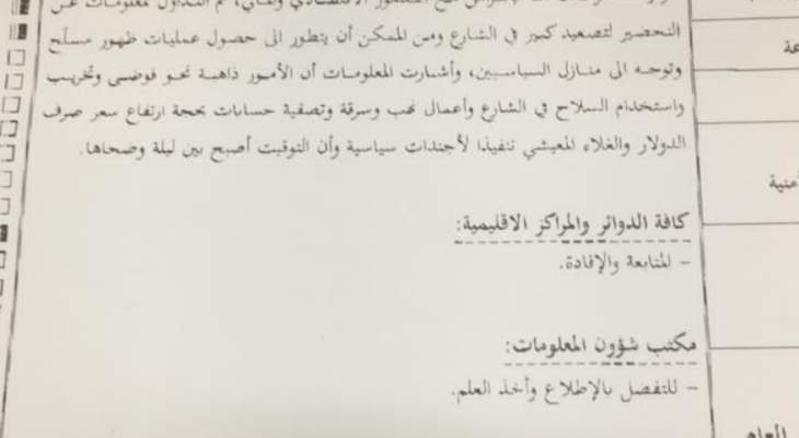 انتشرت على وسائل التواصل الاجتماعي وثيقة للامن العام تحدثت عن توافر معلومات بانه بالتزامن مع التدهور الاقتصادي والمالي، تم التداول بمعلومات عن التحضير لتصعيد كبير في الشارع ومن الممكن ان يتطور الى حصور عمليات ظهور مسلح وتوجه الى منازل السياسيين.