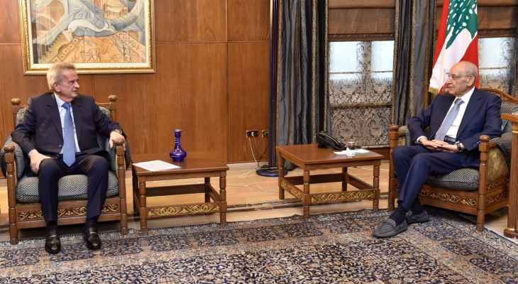 وبعد الظهر استقبل بري حاكم ​مصرف لبنان​ ​رياض سلامة​ حيث جرى التوافق مع حاكمية مصرف لبنان على إعداد إقتراح يضمن قانونية أموال المودعين حتى آخر قرش وزيادة مقدار قيمة الدفع الشهري بالدولار والليرة اللبنانية قبل البحث بأي صيغة للكابيتال كونترول أو غيره”.