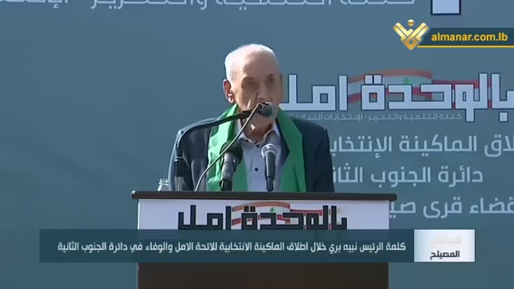 أطلق رئيس مجلس النواب اللبناني نبيه بري من دارته بالمصيلح جنوب لبنان الجمعة الماكينة الانتخابية للائحة الامل والوفاء في دائرة الجنوب الثانية أي قضاء قرى صيدا الزهراني والمصيلح.