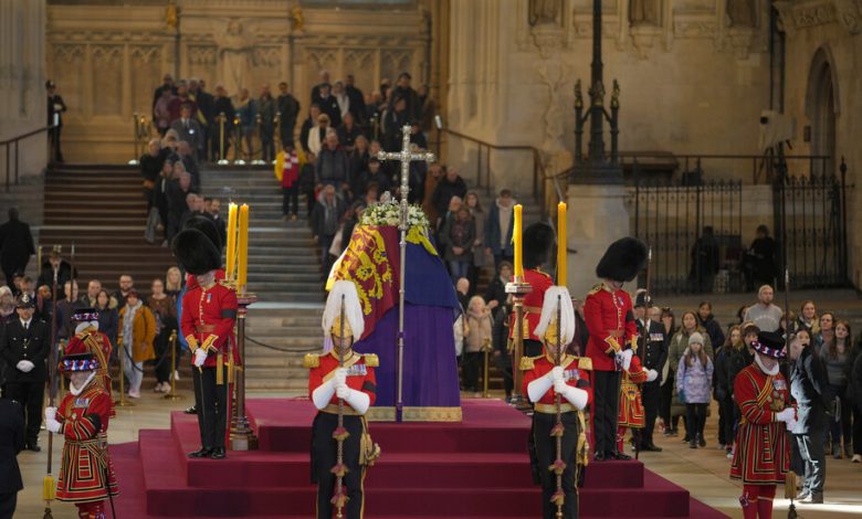 واصطف الآلاف في طوابير طيلة الأيام الماضية، للتمكن من إلقاء نظرة الوداع على الملكة، التي ترقد في نعش يحمل رموز الحكم الملكي، وهي تاج الإمبراطورية البريطانية و”الجرم السماوي” وصولجان الملك إدوارد السابع المزينان بأحجار ” كولينان 1 وكولينان 2″، وذلك في قاعة وستمنستر في العاصمة لندن.