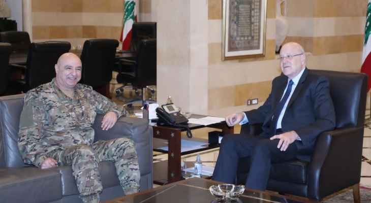 عرض رئيس حكومة تصريف الاعمال نجيب ميقاتي مع قائد الجيش العماد جوزيف عون الوضع الامني في البلاد.