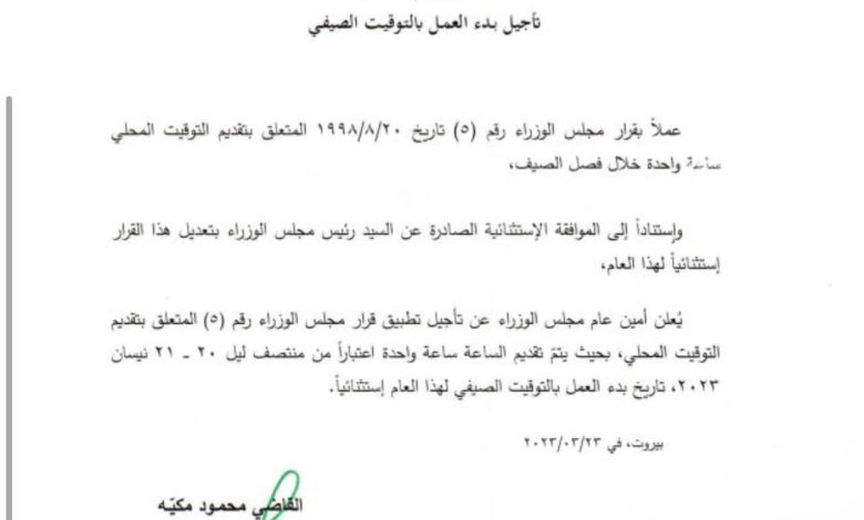 اعلن الامين العام لمجلس الوزراء القاضي محمود مكيه “تأجيل تطبيق قرار مجلس الوزراء المتعلق بتقديم التوقيت المحلي، بحيث يتم تقديم الساعة ساعة واحدة اعتبارا من منتصف ليل 20 -21 نيسان 2023 تاريخ بدء العمل بالتوقيت الصيفي لهذا العام استثنائيا”.